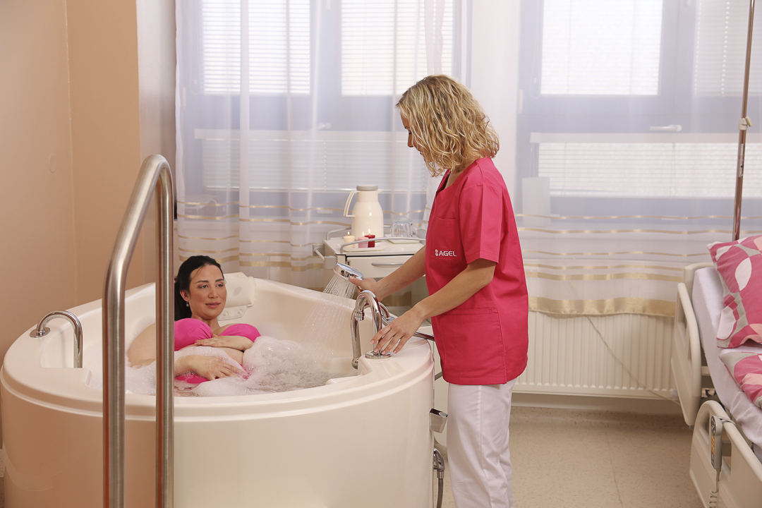 Rodička má u nás možnost využívat sprchu i vanu k úlevě a tlumení bolestí. Hydroterapie, tedy pobyt v teplé vodě během první doby porodní, má uklidňující účinek, snižuje stres a napětí, uvolňuje svaly a vazy, a tím snižuje intenzitu kontrakcí.